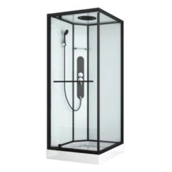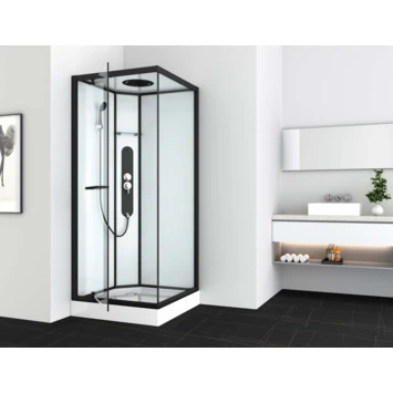 De Allibert douchecabine La Paz 90x90cm is een complete douchecabine voor plaatsing in een hoek. De cabine is vierkant en heeft één draaideur waarmee er een frontale instap wordt gecreëerd. De volledige douchecabine is eenvoudig te installeren met een clipsysteem. Hierdoor zijn er geen schroeven nodig, hoeft er niet geboord te worden en is de installatie siliconenvrij. De cabine heeft transparant gehard glas van 5mm dik aan de buitenzijde en heeft 4mm dikke witte wanden aan de muurzijde. De Allibert douchecabine La Paz is dankzij de antikalkbescherming onderhoudsvriendelijk. De douchecabine is afgewerkt met vlakke zwartgelakte aluminium profielen en een zwarte handgreep. Binnenin de cabines bevindt zich een zwart gelakt bedieningspaneel voorzien van hydromassagestralen en mechanische keuzemixer. De bijgeleverde handdouche heeft 3 standen. Er bevindt zich ook een douchekop van 25cm in het witte dak. De Allibert douchecabine La Paz 90x90cm is 225cm hoog en heeft 2 jaar garantie.