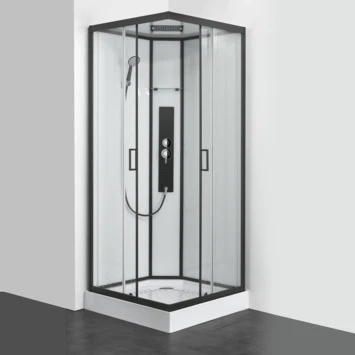 Geniet van een warme douche na een vermoeiende dag. Stap gemakkelijk in de doucheruimte met de instap op de hoek en de antislip-voorziening in de douchebak. De schuifdeuren open je door deze met de handgrepen te schuiven. Je hoeft daardoor in (de indeling van) je badkamer geen rekening te houden met een openzwaaiende deur. De wanden van de douche zijn van doorzichtig veiligheidsglas, zodat je optimale lichtinval hebt vanuit je badkamer. De achterzijde van de cabine is van wit glas gemaakt. Het geheel is afgewerkt in strakke glanzend zwarte aluminium profielen. Dat staat mooi in jouw modern of minimalistisch interieur!