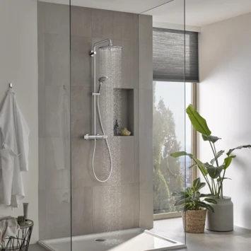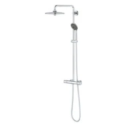 Maak die droomdouche realiteit met de prachtig vervaardigde Grohe Vitalio Joy 260-douche die direct een moderne stijl en prestaties levert en die een leven lang meegaat. Door de snelle montage is deze het perfect voor zowel nieuwe badkamerontwerpen als snelle upgrades. Het vormt ook een genot om te bedienen aangezien het boordevol GROHE’s geavanceerde technologie zit en met ergonomische handgrepen heeft. De bediening is intuïtief met de GROHE ProGrip-handgrepen met gestructureerd oppervlak – zelfs als je gladde handen hebt. Stel de gewenste temperatuur in met GROHE TurboStat en het water blijft precies zoals jij het wilt, zelfs als de toevoer fluctueert. En veiligheid is gegarandeerd, want GROHE 100% CoolTouch zorgt ervoor dat de hele thermostaatbehuizing nooit te heet wordt, dus er is geen risico op verbranding. De gebruiksvriendelijke GROHE SafeStop-functie beperkt de watertemperatuur tot maximaal 38°C – ideaal om kinderen onafhankelijk hun gang te laten gaan in de badkamer – maar kan voor volwassenen worden verhoogd door de hendel te ontgrendelen met de knop. En de optionele GROHE SafeStop Plus-temperatuurbegrenzer kan worden ingesteld op 43° C voor extra veiligheid. Met de handgreep van de AquaDimmer kan je moeiteloos het watervolume regelen en tegelijkertijd schakelen tussen de stroom van de hoofd- en handdouche. GROHE DreamSpray zorgt ervoor dat het water uit elk sproeigaatje van de hoofd- en handdouche gelijkmatig stroomt. En de siliconen SpeedClean-sproeigaatjes zijn gemakkelijk schoon te maken waardoor vuil en kalkaanslag wordt voorkomen. De Vitalio Joy hoofddouche van 260mm heeft een zwenkarm van 450mm. De Vitalio Joy 110mm Massage-handdouche, die wordt geleverd met een 1750 mm twist-freeVitalioFlex Silver-slang en glij-element, heeft ook drie geweldige straalsoorten: de zachte Rain Spray, waterbesparende SmartRain Spray en de krachtige Massage Spray. En voor beide douches beperkt GROHE EcoJoy de waterstroom tot 9,5 l/min, zonder af te doen aan de kwaliteit die het levert. De meerlaagse coating van krasbestendig GROHE StarLight chroom heeft een sprankeling die jarenlang meegaat. En dankzij GROHE QuickFix kan het eenvoudig worden geïnstalleerd met behulp van het bestaande boorgat, aangezien de bovenste beugel verstelbaar is. GROHE Vitalio Joy 260 douchesysteem – een douche met het beste van Duitse vervaardiging!