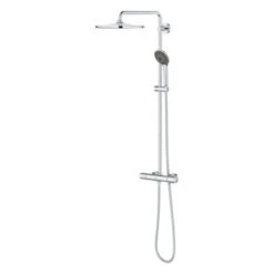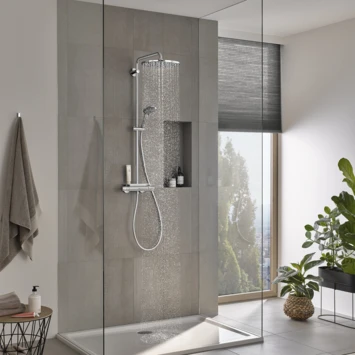 Het Vitalio Joy XXL 310-systeem voegt direct stijl en doucheplezier toe aan moderne badkamers. Dankzij de ergonomische metalen handvatten vormt deze een genot om te bedienen en het is ontworpen om zeer eenvoudig te installeren. Dat betekent dat je in een mum van tijd kunt genieten van alle geavanceerde GROHE-technologie die dit systeem bevat. Nauwkeurige bediening is intuïtief met de GROHE MetalGrip-grepen – de bediening is makkelijk zelfs als je gladde handen hebt. Stel je gewenste temperatuur in met GROHE TurboStat en het water blijft precies zoals jij het wilt, zelfs als de toevoer fluctueert. Veiligheid is ook gegarandeerd, want 100% GROHE CoolTouch betekent dat de hele thermostaatbehuizing nooit te heet wordt, dus er is geen risico op brandwonden. De gebruiksvriendelijke GROHE SafeStop-functie beperkt de watertemperatuur tot maximaal 38°C – ideaal voor gezinnen met kinderen – maar kan voor volwassenen worden verhoogd door de hendel te ontgrendelen met de knop. En de optionele GROHE SafeStop Plus temperatuurbegrenzer kan voor extra veiligheid worden ingesteld op 43° C. Met de AquaDimmer van de Precision Joy-thermostaat kan je moeiteloos het watervolume regelen en tegelijkertijd schakelen tussen de hoofd- en handdouche. GROHE DreamSpray zorgt ervoor dat het water uit elk sproeigaatje van de hoofd- en handdouche gelijkmatig stroomt. En de siliconen SpeedClean-sproeigaatjes zijn gemakkelijk vuil- en kalkvrij te houden. De royale 310mm Vitalio Rain Mono hoofddouche heeft een 450mm zwenkarm zodat je de perfecte hoek kunt instellen voor de rustgevende Rain Spray. De Vitalio Joy 110mm Massage handdouche, die wordt geleverd met een 1750 mm Twistfree VitalioFlex Silver doucheslang en glij-element, heeft drie geweldige straalsoorten: de klassieke Rain Spray, de krachtigere Massage Spray en de milieuvriendelijke SmartRain Spray. En voor beide douches beperkt de GROHE EcoJoy-technologie de waterstroom tot 9,5 l/min, terwijl je op kwaliteit niet inlevert. De douche levert namelijk toch pure en bevredigende verwennerij. De meerlaagse coating van krasbestendig GROHE StarLight chroom heeft een sprankeling die jarenlang meegaat. En dankzij GROHE QuickFix kan het eenvoudig worden geïnstalleerd met behulp van bestaande boorgaten, aangezien de bovenste beugel verstelbaar is. Het GROHE Vitalio Joy XXL 310 douchesysteem – waar elegante, moderne stijl en verfijning samenkomen om doucheplezier te creëren!