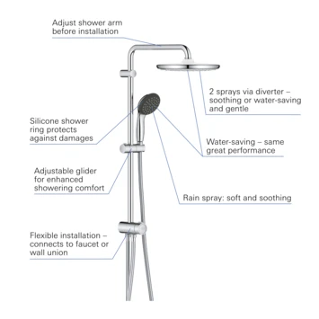 Het Grohe Vitalio start douchesysteem 250 is een systeem dat niet alleen een keuze aan straalsoorten en waterbesparende opties biedt, maar dat je ook alle ruimte biedt die je nodig hebt. Het opbouwsysteem om aan de wand te monteren bestaat uit een Vitalio Start 250 hoofddouche, een Vitalio Start 100 handdouche, een omstelling om eenvoudig te wisselen tussen hoofd- en handdouche, douchestang met 390 mm douchearm en glij-element om de handdouche te verstellen, plus een 1500mm en 1250mm Vitalioflex Trend- doucheslang. De hoofddouche van 250mm biedt een keuze tussen de zachte, ontspannende Rain Spray en de waterbesparende SmartRain Spray – geactiveerd door simpelweg aan de omstelling te draaien. En als je de douche uitzet, zorgt de GROHE DripStop-technologie dat de douche niet na blijft druppelen. De 100mm handdouche wordt geleverd met een ShockProof siliconen ring om hem te beschermen tegen vallen of stoten. Deze bevat de zachte Rain Spray. Beide douches zijn voorzien van waterbesparende GROHE EcoJoy – de stroming wordt beperkt tot 9,5 l/min bij de hoofddouche en 5,7 l/min bij de handdouche – waardoor je minder water verbruikt maar wel geniet van dezelfde geweldige prestaties. GROHE DreamSpray zorgt ervoor dat de stroom uit elk sproeigaatje precies goed is waardoor je douche-ervaring nog meer comfort en plezier biedt. De SpeedClean-sproeigaatjes zijn ontworpen om de kalkaanslag met je vinger vanaf te vegen. De duurzame, schitterende GROHE StarLight chroom afwerking zorgt ervoor dat het douchesysteem er een leven lang prachtig uit blijft zien. De flexibele installatie en gemakkelijke aansluiting via de 1250mm doucheslang maakt dit systeem compatibel met de kranen in je bestaande douche, zodat je deze in een mum van tijd kunt upgraden.
