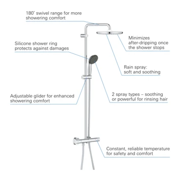 Stap onder een douche waar je meer bewegingsruimte hebt, met verschillende aangename straalsoorten en met alle gemaksvoordelen die een thermostaat biedt. Dit opbouwsysteem om aan de wand te monteren bestaat uit een Vitalio Start 250 hoofddouche, een Vitalio Start 100 handdouche, thermostaat, douchestang met 390mm zwenkbare douchearm en glij-element om de handdouche te verstellen, plus een 1750mm VitalioFlex Comfort Twistfree doucheslang. De hoofddouche van 250mm biedt een zachte, ontspannende Rain Spray. De 100mm handdouche wordt geleverd met een ShockProof siliconen ring om hem te beschermen tegen vallen of stoten. Het heeft 2 straalsoorten; de zachte Rain Spray en de krachtige, gerichte Jet Spray. Beide douches zijn voorzien van waterbesparende GROHE EcoJoy – de stroming wordt beperkt tot 9,5 l/min bij de hoofddouche en 5,7 l/min bij de handdouche – waardoor je minder water verbruikt maar wel geniet van dezelfde geweldige prestaties. GROHE DreamSpray zorgt ervoor dat de stroom uit elk sproeigaatje precies goed is waardoor je douche-ervaring nog meer comfort en plezier biedt. De SpeedClean-sproeigaatjes zijn ontworpen om de kalkaanslag met je vinger vanaf te vegen. Het douchesysteem levert water met een constante temperatuur zodat je nooit voor onaangename verrassingen komt te staan dankzij GROHE’s TurboStat-technologie. Om je te beschermen tegen verbranding is de GROHE SafeStop-knop ingesteld op 38°C om te voorkomen dat met name kinderen de watertemperatuur per ongeluk te hoog zetten. En de GROHE SafeStop Plus-temperatuurbegrenzer kan worden ingesteld op 43°C voor extra veiligheid. Schakel tussen hoofd- en handdouche en regel het volume, allemaal via één handgreep dankzij de AquaDimmer-functie. De duurzame maar oogverblindende GROHE StarLight chroom afwerking zorgt ervoor dat het douchesysteem er jarenlang onberispelijk uit blijft zien.